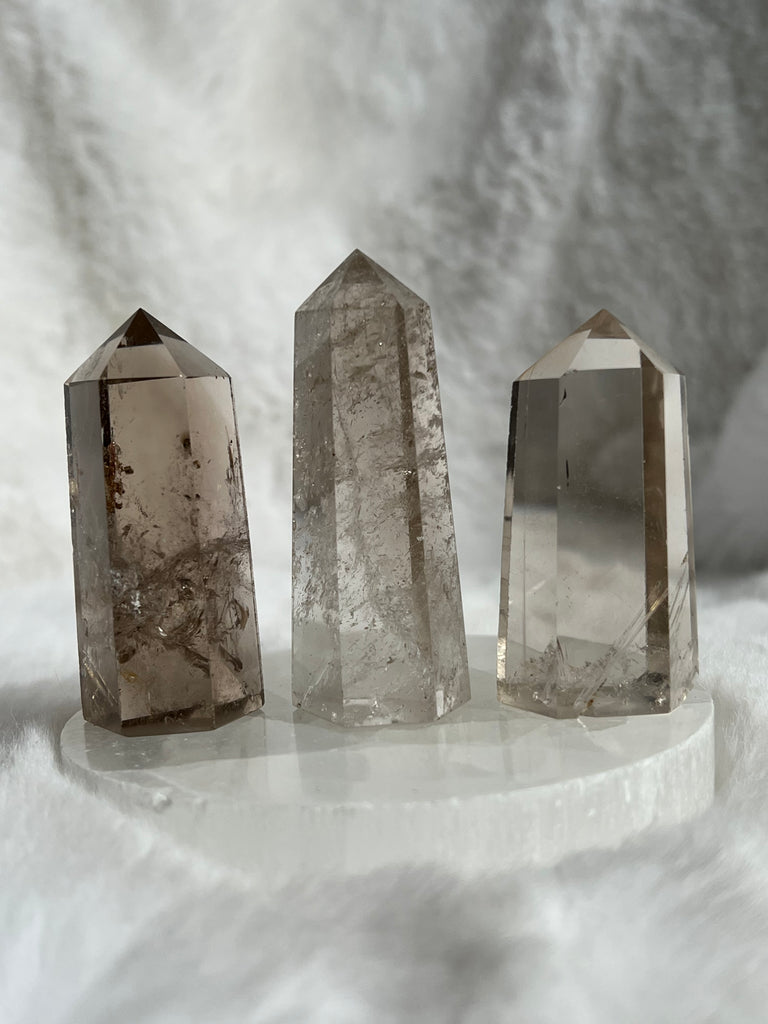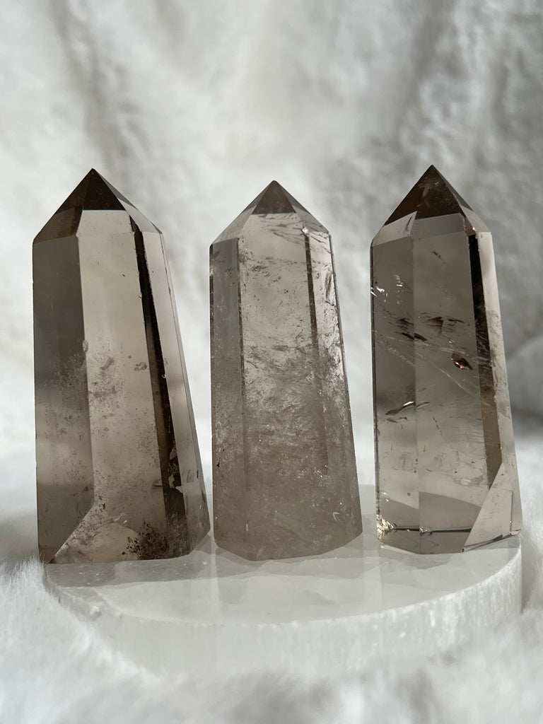 Beautiful smokey Quartz chunky Points. Smoky Quartz crystal is a grounding stone known for its ability to help you move on from difficult or painful experiences. It guides you to a higher state of being, a place where you can let go of the past so that it makes you better, not bitter. Leave the past in the past and move on toward a brighter future with the help of the Smoky Quartz crystal properties.